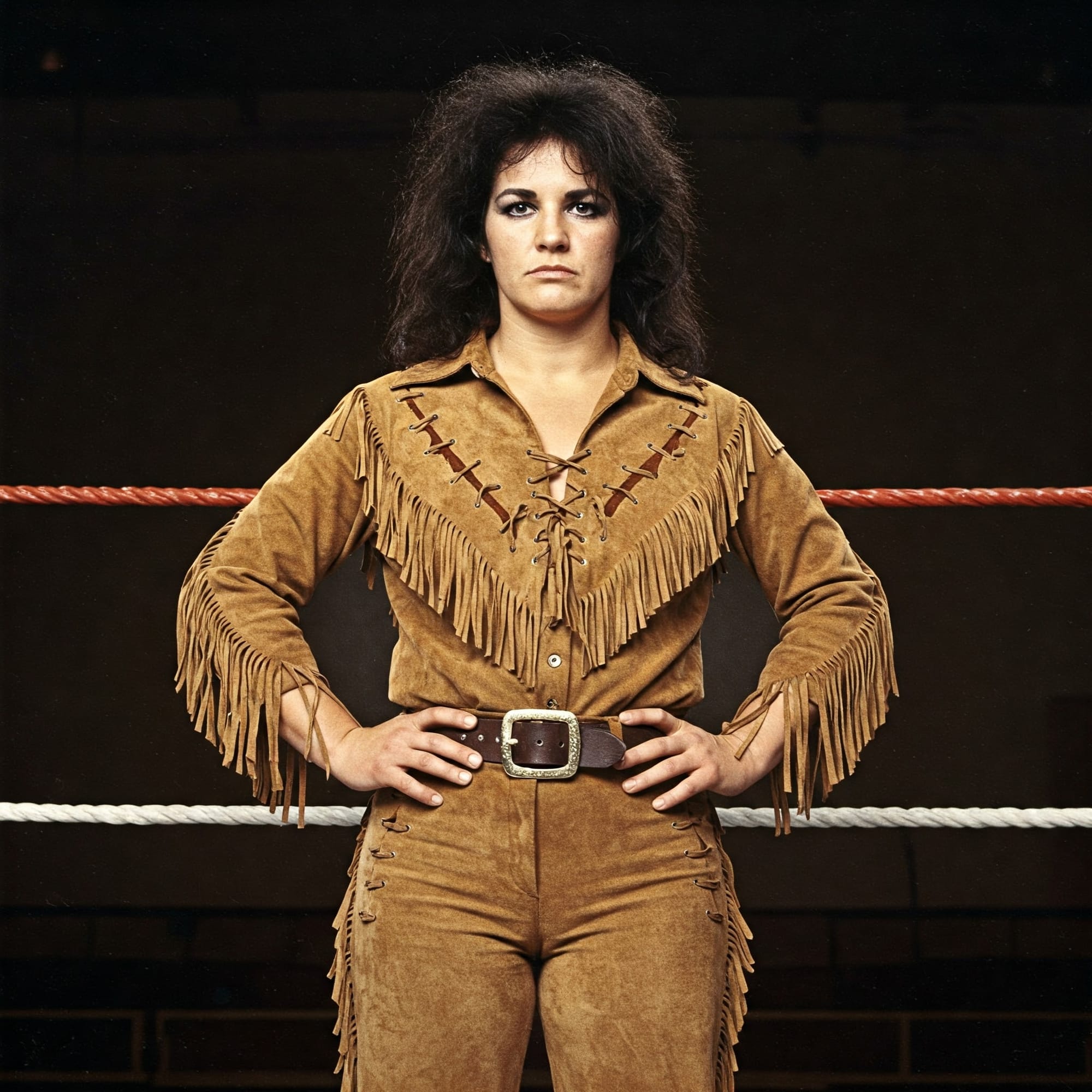 Calamity Queen embodied frontier ruggedness with her weathered buckskin jacket adorned with fringe and subtle rose embroidery. She wore wrestling tights designed to resemble worn denim, paired with scuffed brown wrestling boots. Her thick dark brown hair was usually wild and untamed, often with flyaway strands framing her face. She wore minimal makeup, with the occasional black eyeliner to enhance her intense hazel eyes. A tooled leather belt with a tarnished silver buckle completed her signature look, sometimes accompanied by a coiled bullwhip she'd crack during entrances.