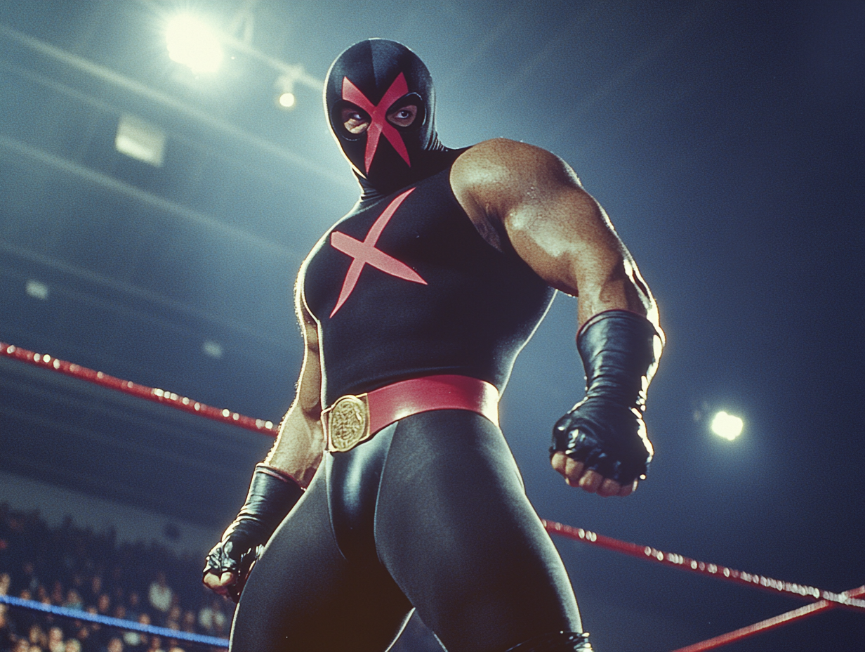 Luchador X cut an imposing figure in his midnight-black ring gear accented with crimson streaks. His mask, featuring a prominent red "X" across the forehead and narrow eye slits, became iconic in the territory. He wore sleeveless black tops, matching trunks with diagonal red slashes, and black boots with red laces. Outside the ring, he maintained his mysterious appearance in black track jackets and dark slacks, often adding tinted aviator glasses over his mask.