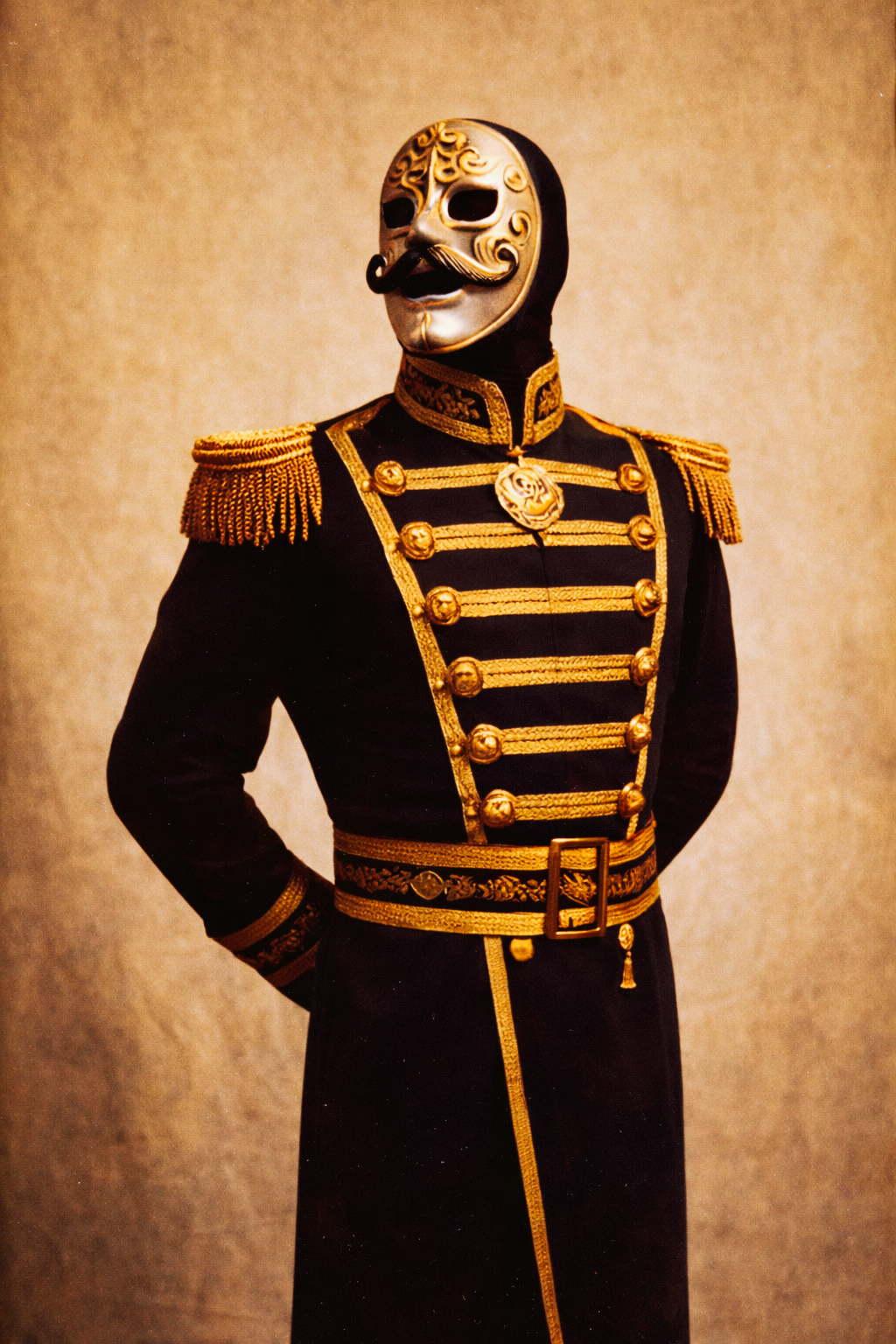 The Viceroy presented himself as a colonial official who wandered into a wrestling ring and refused to leave. His metallic silver mask featured an emotionless aristocratic expression with deep-set eye holes that cast permanent shadows across his face. He wore dark navy or crimson uniform-style trunks with gold trim and insignia, tall black polished boots, and gloves or cuffs emphasizing formality.